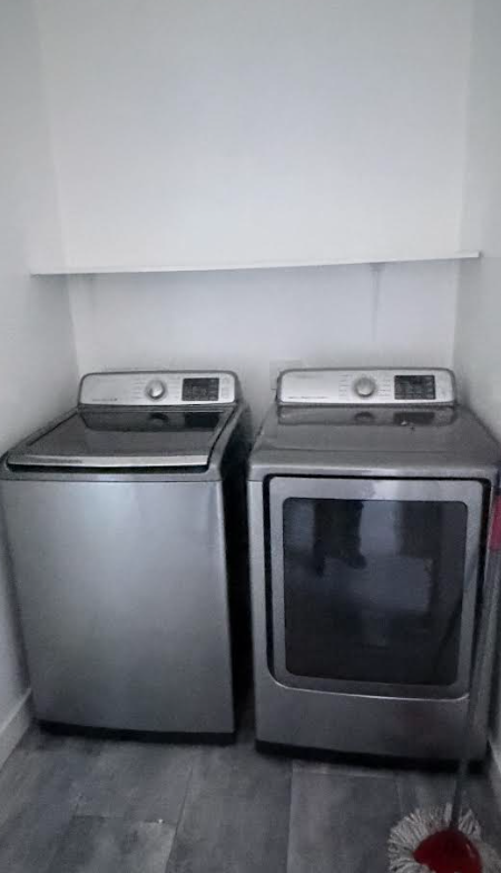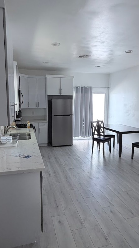 Laundry inside, refrigerator, dishwasher, and new kitchen cabinets